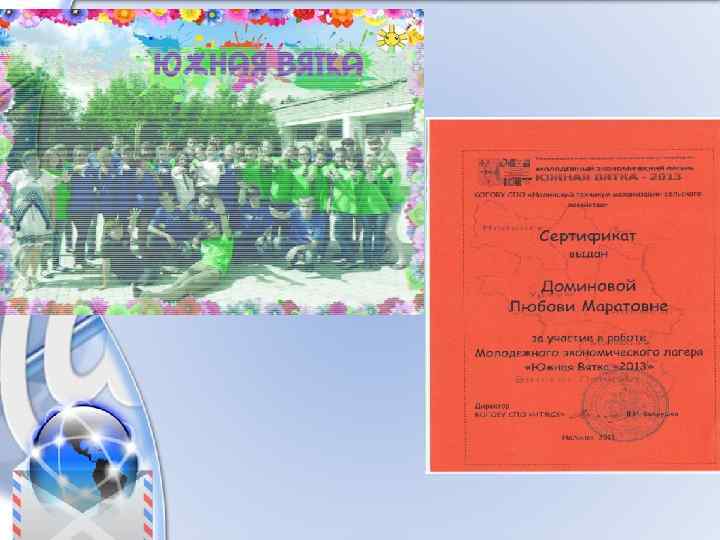 Поездка в летний лагерь «Южная Вятка – 2013» Мне в учебное время поступило предложение написать бизнес план «Из прошлого – в настоящее» . Я задалась целью написать историю его основания Савальского техникума и его охранного парка. На основе этого я предложила проект «Спорткомплекс Олимп» , который включал себя главный корпус и лыжные трасы. Мне пришлось очень много приложить сил, чтобы сделать финансовый план. И когда мне вручили сертификат на поездку в экономический лагерь «Южная Вятка» , я была изрядно шокирована, так как не думала, что мой проект оценят должным вниманием.