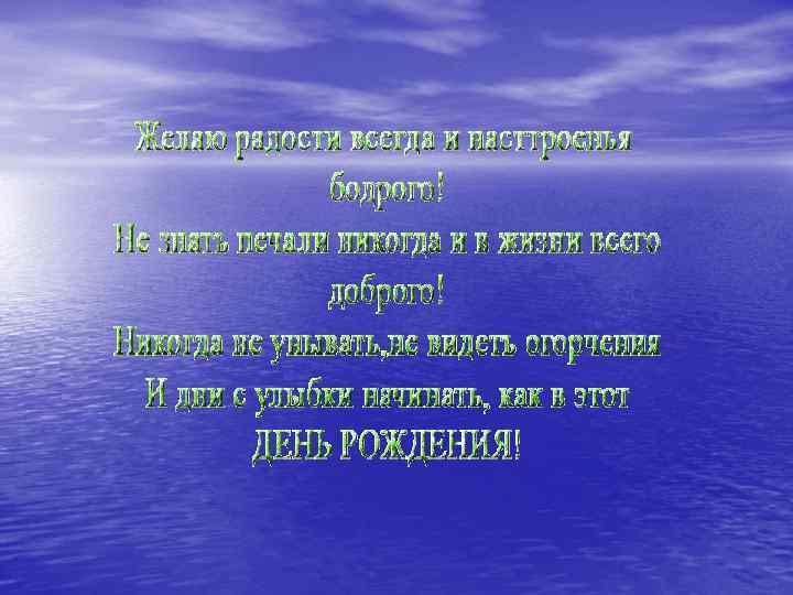 Желаю этот день рождения Тебе в круизе провести, Чтоб были сны и приключенья, Костры любовные, мосты. В морях – беззубые акулы, Сирен морских волшебный гул, В бокале айсбергов немного И чтоб «Титаник» не тонул!