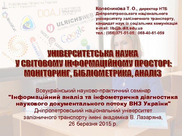 Колесникова Т. О. , директор НТБ Дніпропетровського національного університету залізничного транспорту, кандидат наук із соціальних комунікацій e-mail: lib@b. diit. edu. ua тел. : (056)371 -51 -05; 068 -40 -61 -059 Всеукраїнський науково-практичний семінар "Інформаційний аналіз та інфометрична діагностика наукового документального потоку ВНЗ України" Дніпропетровський національний університет залізничного транспорту імені академіка В. Лазаряна, 26 березня 2015 р.