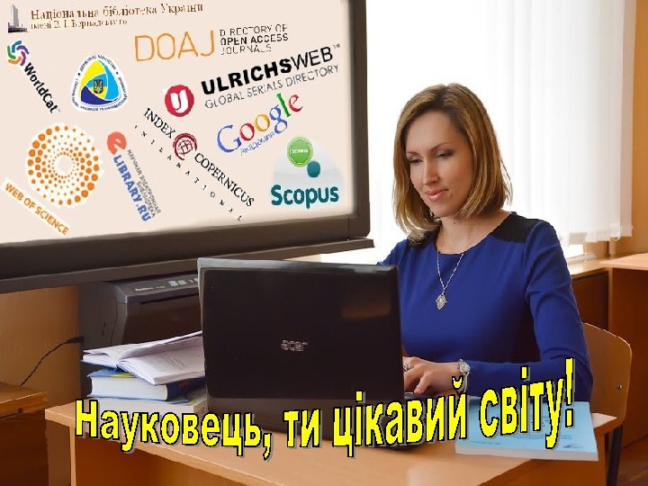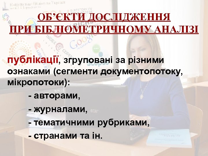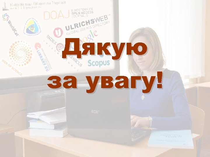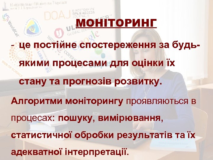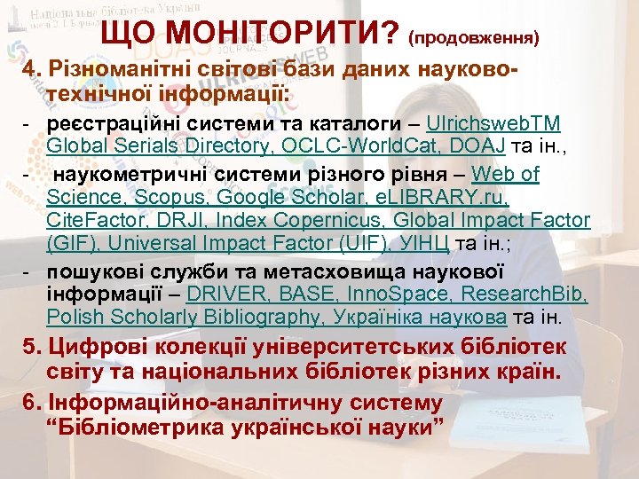 ЩО МОНІТОРИТИ? (продовження) 4. Різноманітні світові бази даних науковотехнічної інформації: - реєстраційні системи та каталоги – Ulrichsweb. TM Global Serials Directory, OCLC-World. Cat, DOAJ та ін. , - наукометричні системи різного рівня – Web of Science, Scopus, Google Scholar, e. LIBRARY. ru, Cite. Factor, DRJI, Index Copernicus, Global Impact Factor (GIF), Universal Impact Factor (UIF), УІНЦ та ін. ; - пошукові служби та метасховища наукової інформації – DRIVER, BASE, Inno. Space, Research. Bib, Polish Scholarly Bibliography, Україніка наукова та ін. 5. Цифрові колекції університетських бібліотек світу та національних бібліотек різних країн. 6. Інформаційно-аналітичну систему “Бібліометрика української науки”