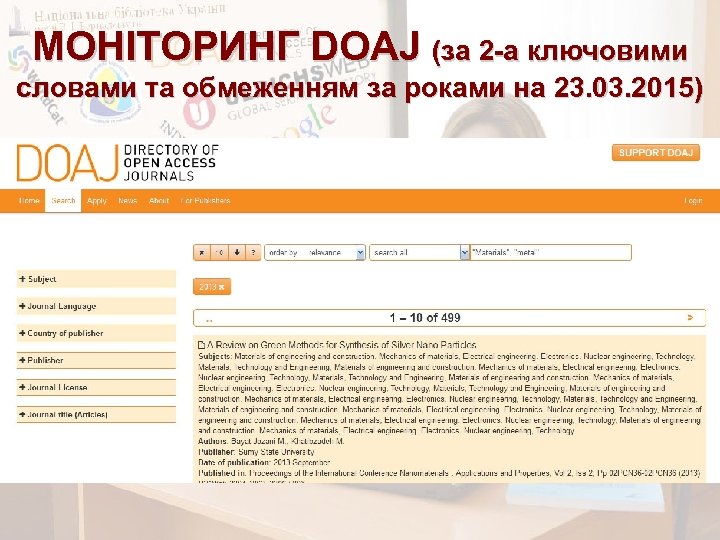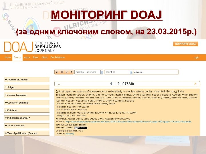 МОНІТОРИНГ DOAJ (за одним ключовим словом, на 23. 03. 2015 р. )