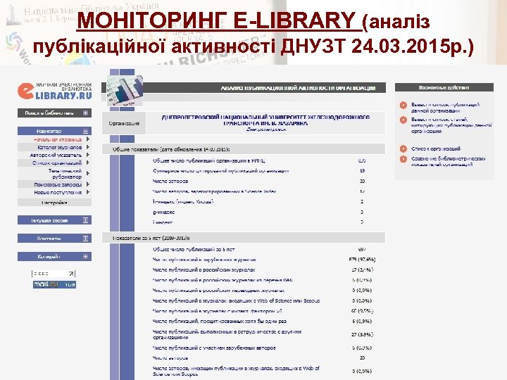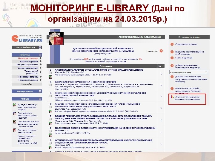 МОНІТОРИНГ E-LIBRARY (аналіз публікаційної активності ДНУЗТ 24. 03. 2015 р. )