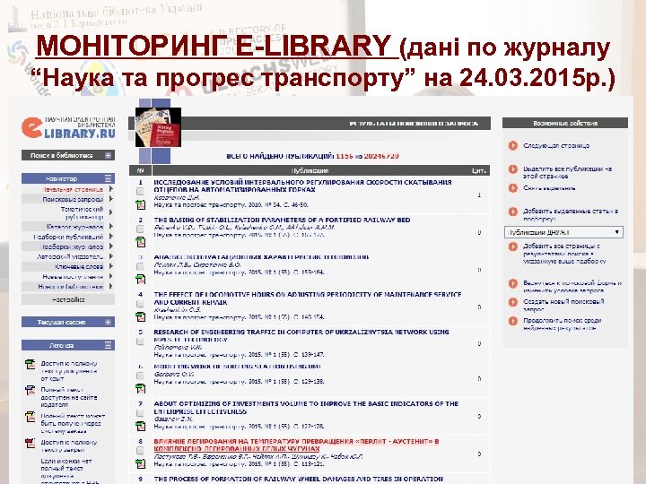 МОНІТОРИНГ E-LIBRARY (дані по журналу “Наука та прогрес транспорту” на 24. 03. 2015 р. )