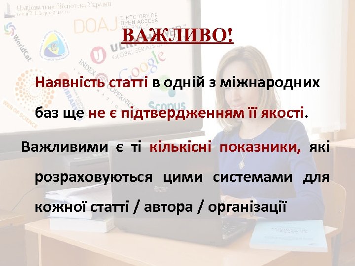 ВАЖЛИВО! Наявність статті в одній з міжнародних баз ще не є підтвердженням її якості. Важливими є ті кількісні показники, які розраховуються цими системами для кожної статті / автора / організації