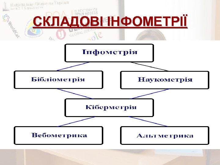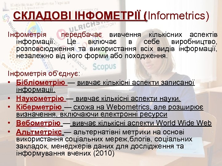 СКЛАДОВІ ІНФОМЕТРІЇ (Informetrics) СКЛАДОВІ ІНФОМЕТРІЇ ( Інфометрія передбачає вивчення кількісних аспектів інформації. Це включає в себе виробництво, розповсюдження та використання всіх видів інформації, незалежно від його форми або походження. Інфометрія об’єднує: • Бібліометрію — вивчає кількісні аспекти записаної інформації. • Наукометрію — вивчає кількісні аспекти науки. • Кіберметрію — схожа на Webometrics, але розширює визначення, включаючи електронні ресурси • Вебометрію — вивчає кількісні аспекти World Wide Web • Альтметрікс — альтернатівні метрики на основі використання соціальних мереж, блогів, соціальних закладок, менеджерів даних для дослідження та інформування вчених (2010)