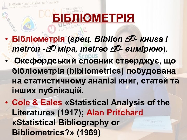 БІБЛІОМЕТРІЯ • Бібліометрія (грец. Biblion - книга і metron - міра, metreo - вимірюю). • Оксфордський словник стверджує, що бібліометрія (bibliometrics) побудована на статистичному аналізі книг, статей та інших публікацій. • Cole & Eales «Statistical Analysis of the Literature» (1917); Alan Pritchard «Statistical Bibliography or Bibliometrics? » (1969)
