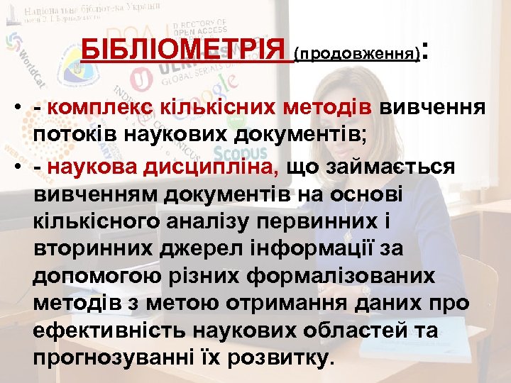 БІБЛІОМЕТРІЯ (продовження): • - комплекс кількісних методів вивчення потоків наукових документів; • - наукова дисципліна, що займається вивченням документів на основі кількісного аналізу первинних і вторинних джерел інформації за допомогою різних формалізованих методів з метою отримання даних про ефективність наукових областей та прогнозуванні їх розвитку.