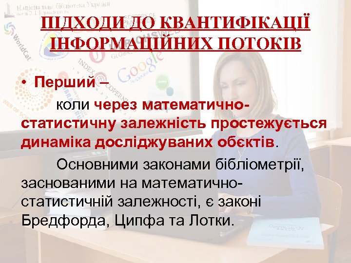 ПІДХОДИ ДО КВАНТИФІКАЦІЇ ІНФОРМАЦІЙНИХ ПОТОКІВ • Перший – коли через математичностатистичну залежність простежується динаміка досліджуваних обєктів. Основними законами бібліометрії, заснованими на математичностатистичній залежності, є законі Бредфорда, Ципфа та Лотки.