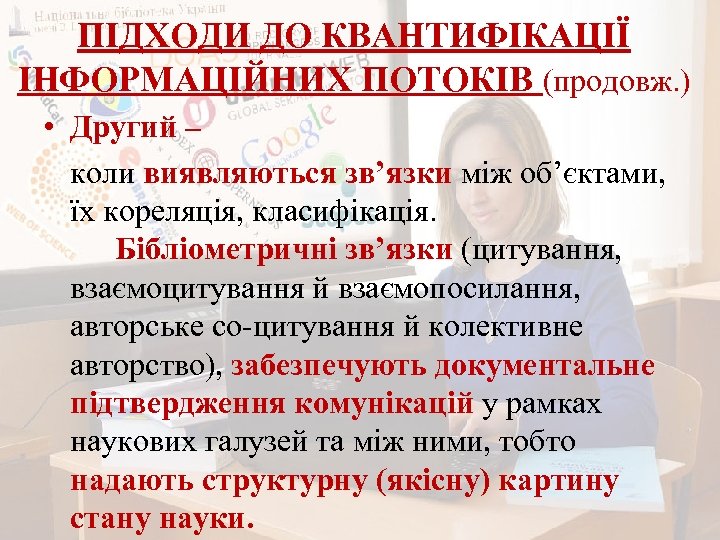 ПІДХОДИ ДО КВАНТИФІКАЦІЇ ІНФОРМАЦІЙНИХ ПОТОКІВ (продовж. ) • Другий – коли виявляються зв’язки між об’єктами, їх кореляція, класифікація. Бібліометричні зв’язки (цитування, взаємоцитування й взаємопосилання, авторське со-цитування й колективне авторство), забезпечують документальне підтвердження комунікацій у рамках наукових галузей та між ними, тобто надають структурну (якісну) картину стану науки.