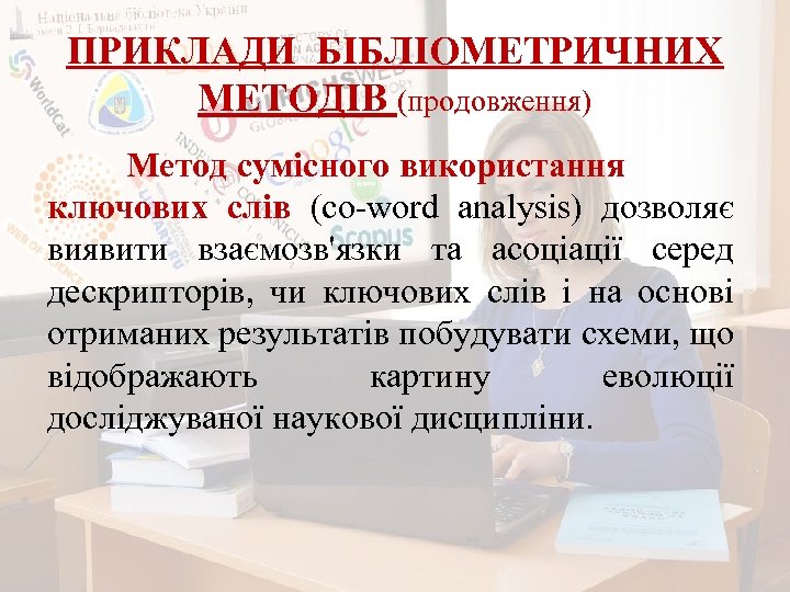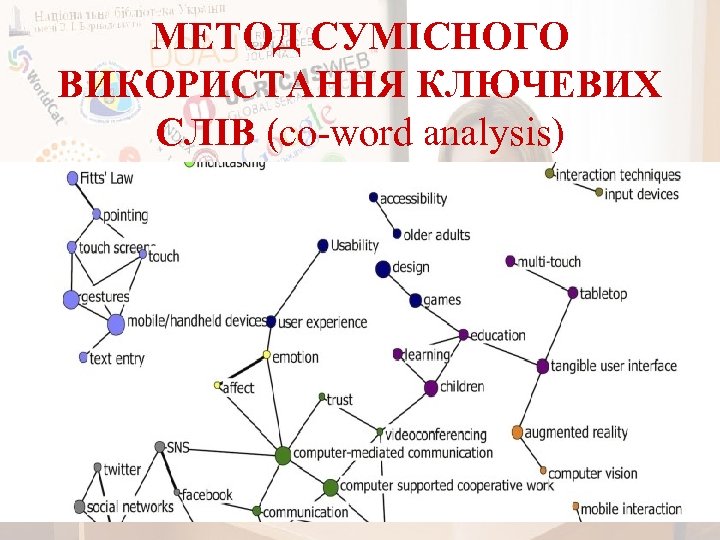 ПРИКЛАДИ БІБЛІОМЕТРИЧНИХ МЕТОДІВ (продовження) Метод сумісного використання ключових слів (co-word analysis) дозволяє виявити взаємозв'язки та асоціації серед дескрипторів, чи ключових слів і на основі отриманих результатів побудувати схеми, що відображають картину еволюції досліджуваної наукової дисципліни.