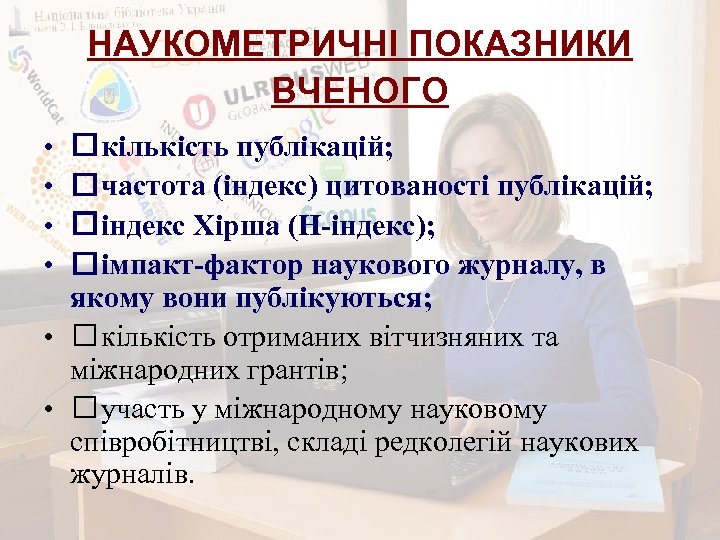 НАУКОМЕТРИЧНІ ПОКАЗНИКИ: ЗАГАЛЬНІ ПОНЯТТЯ • Індекс цитування – прийнята в науковому світі міра «значущості» праць ученого. Величина індексу визначається кількістю посилань на цю працю (або прізвище) в інших джерелах; • Індекс Хірша є кількісною характеристикою продуктивності вченого, заснованою не тільки на кількості цитувань його публікацій, але й на кількості цих публікацій; • Імпакт- фактор журналу – це чисельний показник авторитетності наукового журналу, що відображує кількість посилань на статті, опубліковані в журналі за два попередні роки, відносно до загальної кількості статей, опублікованих у цьому ж журналі за ці роки.