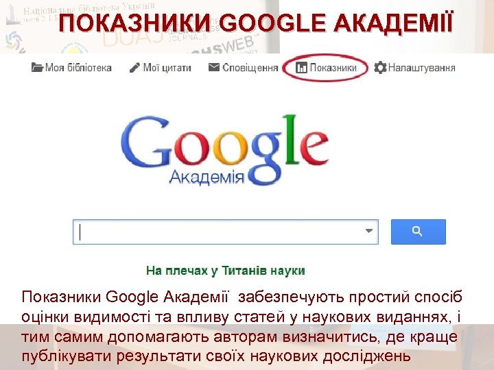 ПОКАЗНИКИ GOOGLE АКАДЕМІЇ Показники Google Академії забезпечують простий спосіб оцінки видимості та впливу статей у наукових виданнях, і тим самим допомагають авторам визначитись, де краще публікувати результати своїх наукових досліджень