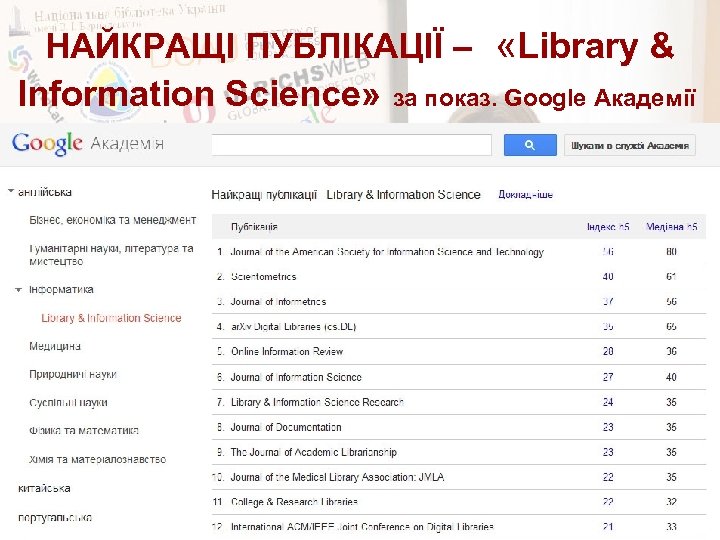 НАЙКРАЩІ ПУБЛІКАЦІЇ – «Library & Information Science» за показ. Google Академії
