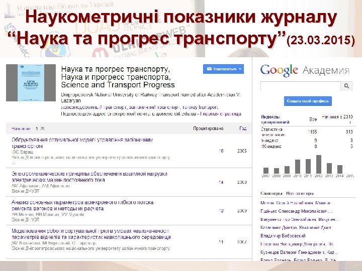 Наукометричні показники журналу “Наука та прогрес транспорту”(23. 03. 2015)