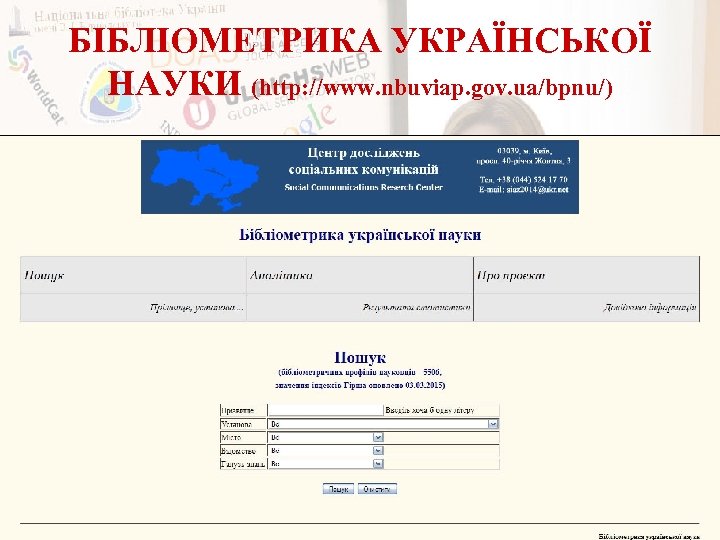 БІБЛІОМЕТРИКА УКРАЇНСЬКОЇ НАУКИ (http: //www. nbuviap. gov. ua/bpnu/)