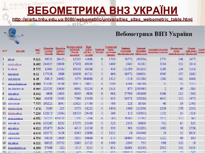 ВЕБОМЕТРИКА ВНЗ УКРАЇНИ http: //elartu. tntu. edu. ua: 8080/webometric/universities_sites_webometric_table. html
