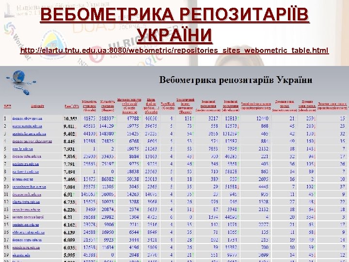 ВЕБОМЕТРИКА РЕПОЗИТАРІЇВ УКРАЇНИ http: //elartu. tntu. edu. ua: 8080/webometric/repositories_sites_webometric_table. html