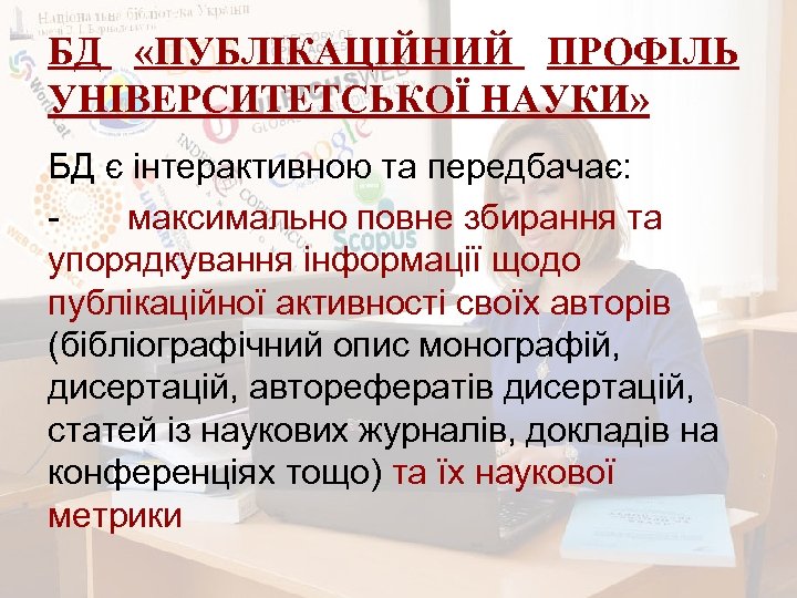 БД «ПУБЛІКАЦІЙНИЙ ПРОФІЛЬ УНІВЕРСИТЕТСЬКОЇ НАУКИ» БД є інтерактивною та передбачає: максимально повне збирання та упорядкування інформації щодо публікаційної активності своїх авторів (бібліографічний опис монографій, дисертацій, авторефератів дисертацій, статей із наукових журналів, докладів на конференціях тощо) та їх наукової метрики
