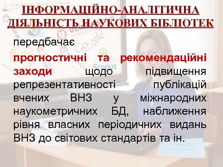 ІНФОРМАЦІЙНО-АНАЛІТИЧНА ДІЯЛЬНІСТЬ НАУКОВИХ БІБЛІОТЕК передбачає прогностичні та рекомендаційні заходи щодо підвищення репрезентативності публікацій вчених ВНЗ у міжнародних наукометричних БД, наближення рівня власних періодичних видань ВНЗ до світових стандартів та ін.