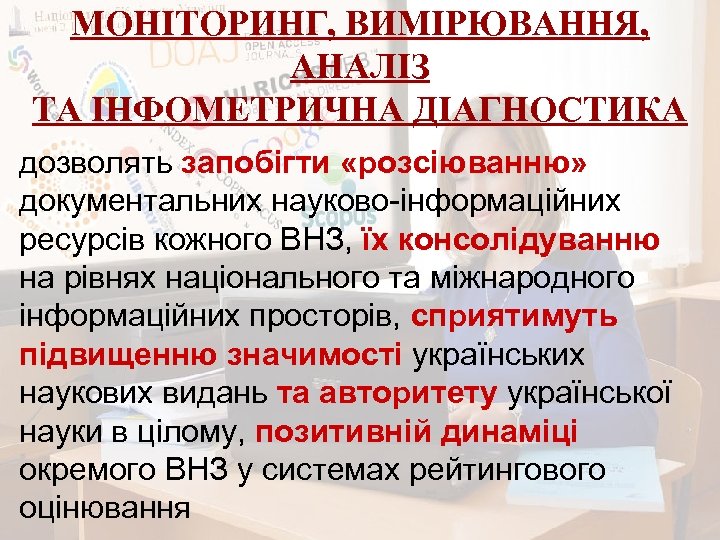 МОНІТОРИНГ, ВИМІРЮВАННЯ, АНАЛІЗ ТА ІНФОМЕТРИЧНА ДІАГНОСТИКА дозволять запобігти «розсіюванню» документальних науково-інформаційних ресурсів кожного ВНЗ, їх консолідуванню на рівнях національного та міжнародного інформаційних просторів, сприятимуть підвищенню значимості українських наукових видань та авторитету української науки в цілому, позитивній динаміці окремого ВНЗ у системах рейтингового оцінювання