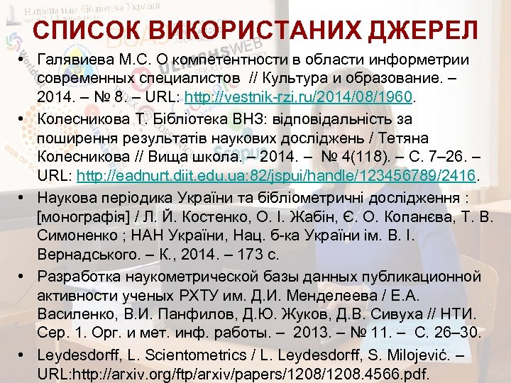 СПИСОК ВИКОРИСТАНИХ ДЖЕРЕЛ • Галявиева М. С. О компетентности в области информетрии современных специалистов // Культура и образование. – 2014. – № 8. – URL: http: //vestnik-rzi. ru/2014/08/1960. • Колесникова Т. Бібліотека ВНЗ: відповідальність за поширення результатів наукових досліджень / Тетяна Колесникова // Вища школа. – 2014. – № 4(118). – С. 7– 26. – URL: http: //eadnurt. diit. edu. ua: 82/jspui/handle/123456789/2416. • Наукова періодика України та бібліометричні дослідження : [монографія] / Л. Й. Костенко, О. І. Жабін, Є. О. Копанєва, Т. В. Симоненко ; НАН України, Нац. б-ка України ім. В. І. Вернадського. – К. , 2014. – 173 c. • Разработка наукометрической базы данных публикационной активности ученых РХТУ им. Д. И. Менделеева / Е. А. Василенко, В. И. Панфилов, Д. Ю. Жуков, Д. В. Сивуха // НТИ. Сер. 1. Орг. и мет. инф. работы. – 2013. – № 11. – С. 26– 30. • Leydesdorff, L. Scientometrics / L. Leydesdorff, S. Milojević. – URL: http: //arxiv. org/ftp/arxiv/papers/1208. 4566. pdf.