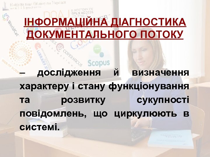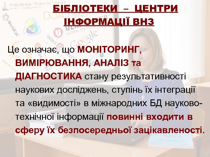 БІБЛІОТЕКИ – ЦЕНТРИ ІНФОРМАЦІЇ ВНЗ Це означає, що МОНІТОРИНГ, ВИМІРЮВАННЯ, АНАЛІЗ та ДІАГНОСТИКА стану результативності наукових досліджень, ступінь їх інтеграції та «видимості» в міжнародних БД науковотехнічної інформації повинні входити в сферу їх безпосередньої зацікавленості.