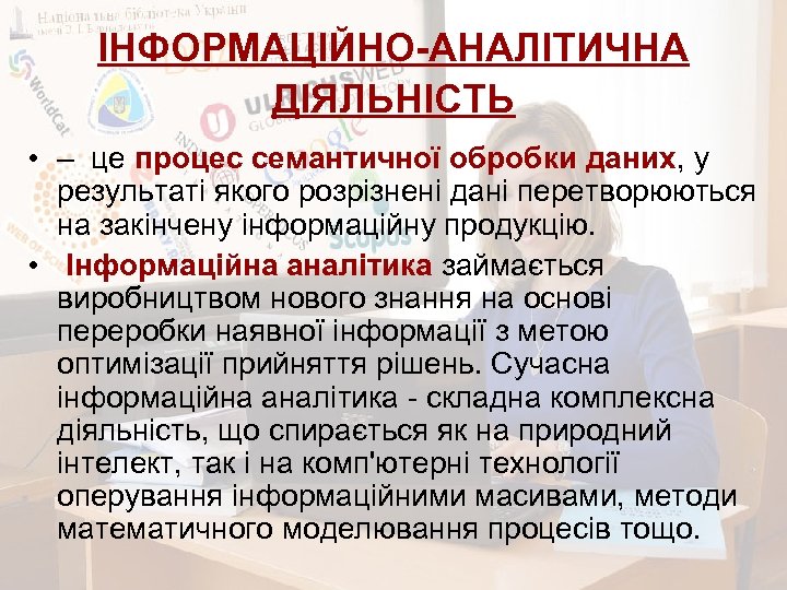 ІНФОРМАЦІЙНО-АНАЛІТИЧНА ДІЯЛЬНІСТЬ • – це процес семантичної обробки даних, у результаті якого розрізнені дані перетворюються на закінчену інформаційну продукцію. • Інформаційна аналітика займається виробництвом нового знання на основі переробки наявної інформації з метою оптимізації прийняття рішень. Сучасна інформаційна аналітика - складна комплексна діяльність, що спирається як на природний інтелект, так і на комп'ютерні технології оперування інформаційними масивами, методи математичного моделювання процесів тощо.