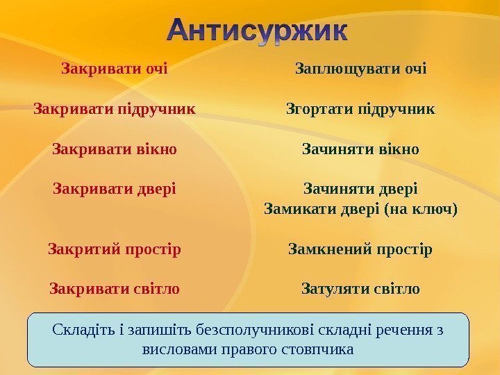 Складіть і запишіть безсполучникові складні речення з висловами правого стовпчика. Закривати очі Закривати підручник Закривати вікно Закривати двері Закритий простір Закривати світло Заплющувати очі Згортати підручник Зачиняти вікно Зачиняти двері Замикати двері (на ключ) Замкнений простір Затуляти світло