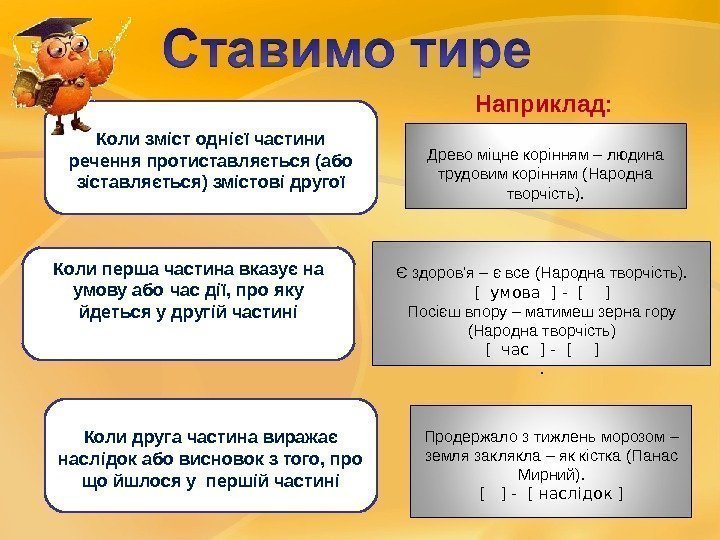 Древо міцне корінням – людина трудовим корінням (Народна творчість). Є здоров’я – є все (Народна творчість). [ умова ] — [ ] Посієш впору – матимеш зерна гору (Народна творчість) [ час ] — [ ]. Продержало з тижлень морозом – земля заклякла – як кістка (Панас Мирний). [ ] — [ наслідок ]Коли зміст однієї частини речення протиставляється (або зіставляється) змістові другої Коли перша частина вказує на умову або час дії, про яку йдеться у другій частині Коли друга частина виражає наслідок або висновок з того, про що йшлося у першій частині Наприклад:
