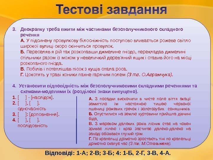 3. Двокрапку треба вжити між частинами безсполучникового складного речення А. У підсинену провулкову білосніжність поступово вливається рожеве світло широкої вулиці скоро скінчиться провулок. Б. Переселяв я рій так розкопавши джмелине гніздо, перекладав джмелині стільники разом із мохом у невеличкий дерев’яний ящик і ставив його на місці розкопаного гнізда. В. Побілів і потеплішав пісок з кущів спала роса. Г. Цокотять у траві коники пахне гарячим по лем (З тв. О. Аврамчука). 4. Установити відповідність між безсполучниковими складними реченнями та схемами-моделями їх (розділові знаки випущено). 1. [ ] — [наслідок]. 2. [ ], [ ]. одночасність 3. [ ]: [доповнення ]. 4. [ ], [ ]. послідовність А. З посадки вискочили в чисте поле віття акації замигтіло їм настояною тишею червоної пшениці рожевих гречок і золотозубих соняшників. Б. Опустилися на землю хуртовини прийшла дівчині біда, В. З маревом далеких років лісник стає на човен зриває лілею і враз застигає далеко-далеко на заході обізвався глухий грім. Г. По крапельці дрімотно зростають тіні по крапельці дрімотно скапує час (3 тв. М. Стельмаха). Відповіді: 1 -А; 2 -В; 3 -Б; 4: 1 -Б, 2 -Г, 3 -В, 4 -А.