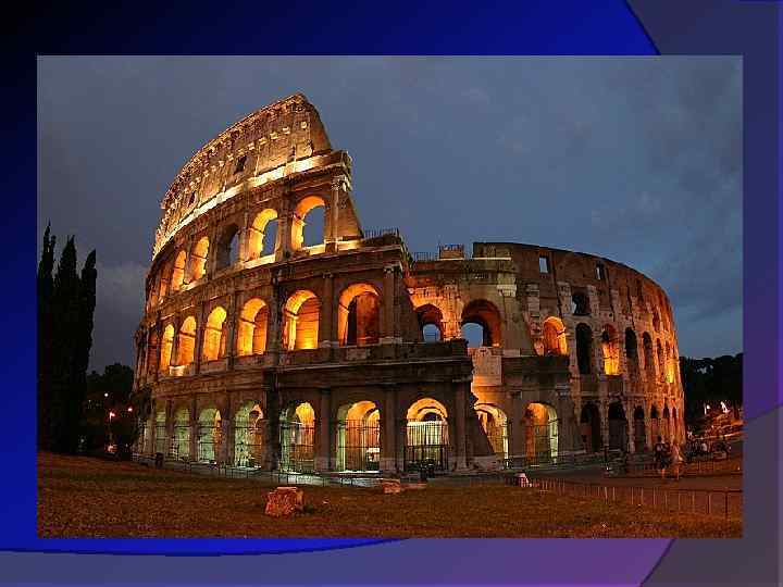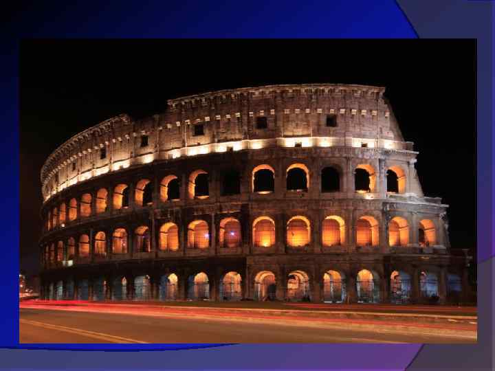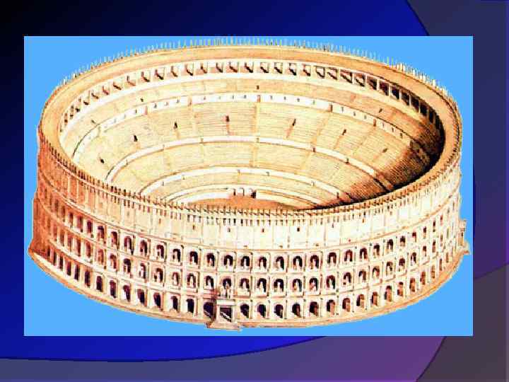 от лат. Colosseus — громадный, колоссальный) самый большой стадион античного мира имеет форму амфитеатра Строительство: 72 -80 гг. Был заложен императором Веспасианом Закончил строительство - император Тито Находится в Риме, в ложбине между Эсквилинским, Палатинским и Целиевским холмами Веспасиан