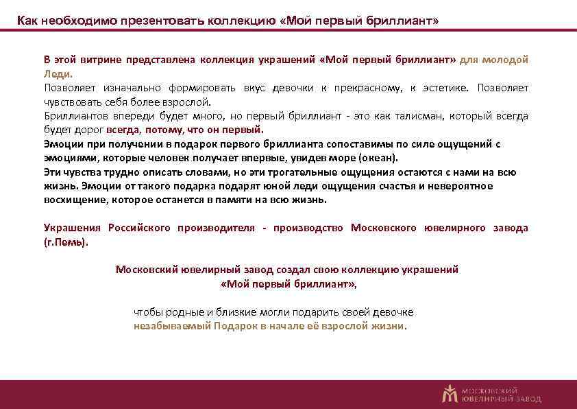 Презентация украшений коллекции «Мой первый бриллиант» Презентовать украшение коллекции «Мой первый бриллиант» , нужно когда определена потребность покупателя: Основная потребность единственная - Украшение в подарок молодой Леди Пример презентации коллекции покупателю: «Подарок, с которым Ваша дочьсестраплемянница получит ощущение счастья и восхищение – это безусловно украшение коллекции «Мой первый бриллиант» . Девушки всегда мечтают об украшении с бриллиантом. А первый в жизни бриллиант - это подарок, который будет дорог его обладательнице всегда, потому, что он первый. Эти чувства трудно будет описать словами. Эмоции при получении в подарок первого бриллианта сопоставимы по силе ощущений с эмоциями, которые человек получает впервые, увидев море (океан). Какие украшения предпочитает Ваша дочьсестра: кольца, серьги или может быть подвески? » После первой части презентации необходимо приступить к демонстрации украшения и продолжать презентацию (пока покупатель рассматривает украшение) «Украшения коллекции «Мой первый бриллиант» – это изделия из золота 585 пробы. Изготовлена коллекция на производстве Московского ювелирного завода. Модели украшений выполнены в более сдержанном стиле, который очень подходит молодым девушкам и делает их еще прекраснее» ….