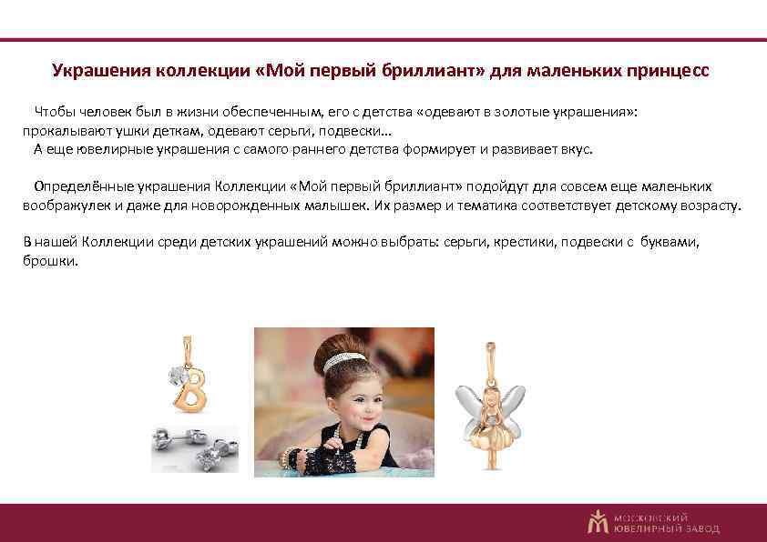 Украшения коллекции «Мой первый бриллиант» для маленьких принцесс Чтобы человек был в жизни обеспеченным, его с детства «одевают в золотые украшения» : прокалывают ушки деткам, одевают серьги, подвески… А еще ювелирные украшения с самого раннего детства формирует и развивает вкус. Определённые украшения Коллекции «Мой первый бриллиант» подойдут для совсем еще маленьких воображулек и даже для новорожденных малышек. Их размер и тематика соответствует детскому возрасту. В нашей Коллекции среди детских украшений можно выбрать: серьги, крестики, подвески с буквами, брошки.