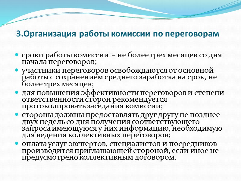 3.Организация работы комиссии по переговорам сроки работы комиссии – не более трех месяцев со дня начала переговоров; участники переговоров освобождаются от основной работы с сохранением среднего заработка на срок, не более трех месяцев; для повышения эффективности переговоров и степени ответственности сторон рекомендуется протоколировать заседания комиссии; стороны должны предоставлять друг другу не позднее двух недель со дня получения соответствующего запроса имеющуюся у них информацию, необходимую для ведения коллективных переговоров; оплата услуг экспертов, специалистов и посредников производится приглашающей стороной, если иное не предусмотрено коллективным договором.