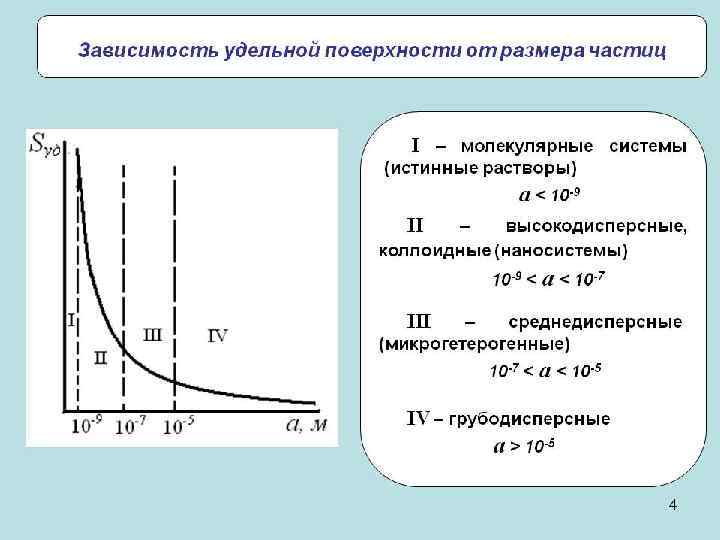 Резкое изменение свойств вещества с повышением дисперсности связано с быстрым увеличением суммарной поверхности раздела между частицами и средой. Большая поверхность раздела создает в коллоидных системах большой запас избыточной поверхностной энергии, который делает коллоидные системы термодинамически неустойчивыми и чрезвычайно реакционноспособными. Количественной мерой раздробленности вещества являются три характеристики: l Размер частиц; l Дисперсность – величина обратная размеру частиц; l Удельная поверхность. Это площадь межфазной поверхности, отнесенная к единице объема дисперсной фазы (V) или ее массы (m).