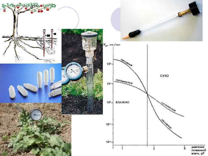В почвоведении капиллярные явления играют очень большую роль. 1. Из уравнения Жюрена следует, что чем тоньше капилляр, тем выше должна подниматься вода. Наблюдения показывают, что вода от уровня грунтовых вод поднимается в: песках – до 35 -80 см; супесях – до 80 -120 см; суглинках – до 120 -350 см; глинах – до 350 -600 см. Для роста растений необходимо, чтобы их корни контактировали с капиллярной каймой грунтовых вод. Поэтому на почвах с более мелкими частицами уровень грунтовых вод может находиться заметно глубже, и это не повлияет негативно на плодородие почв.