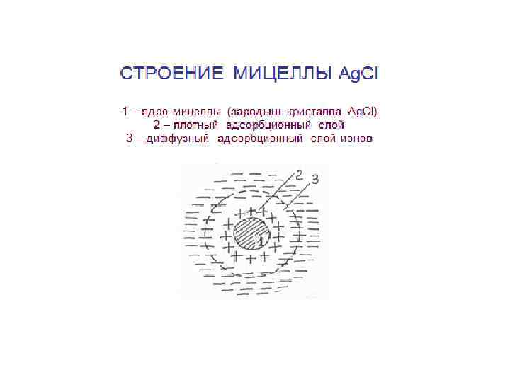 Получение коллоидных частиц хлорида сере Ag. NO 3 + Na. Cl Ag+ + NO 31 - + Na+ + Cl. Избыток Cl. Cl- Ag+ Cl. Cl- Cl- Ag+ Cl- Ag+ Ядро Na+ Cl- Ag+ Cl Избыток Na+ - Cl- Ag+ Cl+ Na+ Cl Ag Cl Na+ - Cl Потенциалопределяющие ионы [(Ag+Cl-)n·m. Cl-]m-·m. Na+ Гранула Мицелла Противоионы