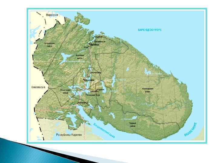 Рельеф - это горы, впадины, террасы. . . Хибины, Ловозёрская тундра, Монче-тундра и другие горные массивы возвышаются над уровнем моря на 800 -1200 м. Более или менее обширные равнины заняты болотами и озёрами. Самая значительная из них Ковдозёрская - находится на юге области.