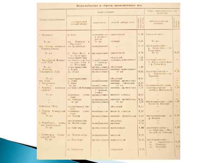 Загрязнение водных объектов На территории полуострова расположены предприятия горнометаллургической, рыбной, лесной, деревообрабатывающей и др. промышленности. Реки Большая Колос-йоки, Нюдуай, Варми-йок и Белая загрязнены настолько, что воду этих рек нельзя использовать для хозяйственно-бытовых и промышленных целей. (они превратились в сточные канавы) Вода в реках Коле, Сергевань, Ковдоре, в оз. Ловозеро и др. загрязнена, но в меньшей степени. Однако в этой воде содержатся вредные вещества.