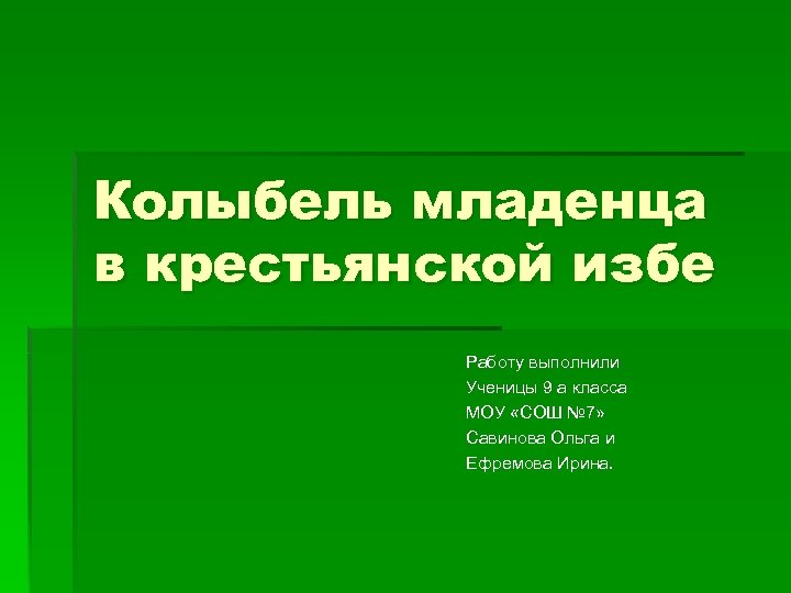 Колыбель младенца в крестьянской избе Работу выполнили Ученицы 9 а класса МОУ «СОШ № 7» Савинова Ольга и Ефремова Ирина.