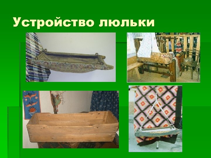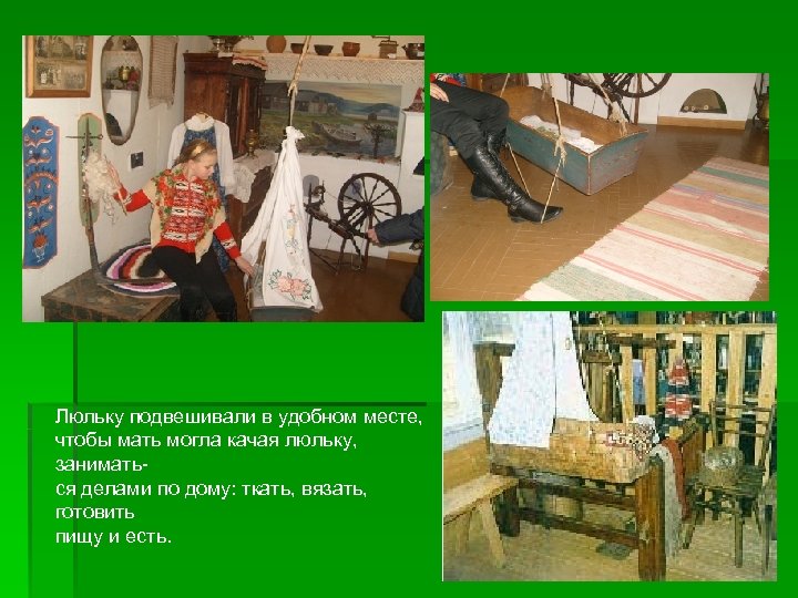 Люльку подвешивали в удобном месте, чтобы мать могла качая люльку, заниматься делами по дому: ткать, вязать, готовить пищу и есть.