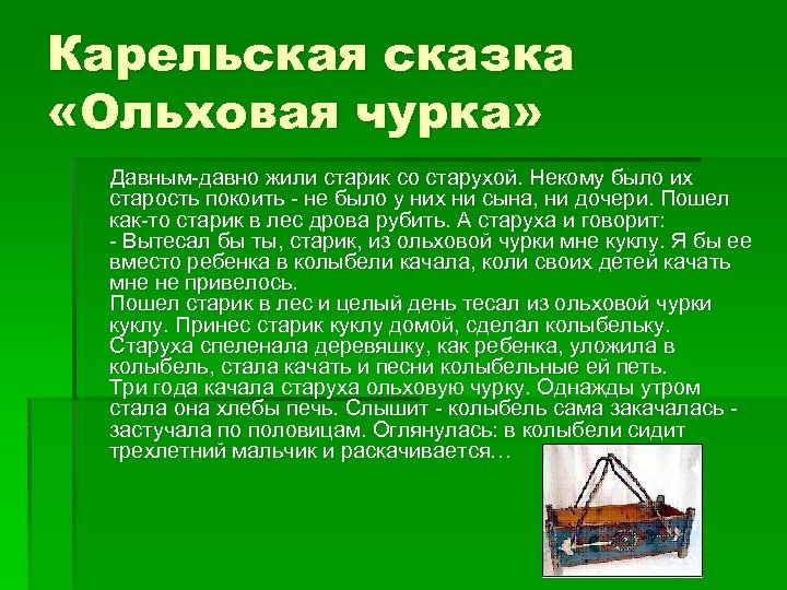 Карельская сказка «Ольховая чурка» Давным-давно жили старик со старухой. Некому было их старость покоить - не было у них ни сына, ни дочери. Пошел как-то старик в лес дрова рубить. А старуха и говорит: - Вытесал бы ты, старик, из ольховой чурки мне куклу. Я бы ее вместо ребенка в колыбели качала, коли своих детей качать мне не привелось. Пошел старик в лес и целый день тесал из ольховой чурки куклу. Принес старик куклу домой, сделал колыбельку. Старуха спеленала деревяшку, как ребенка, уложила в колыбель, стала качать и песни колыбельные ей петь. Три года качала старуха ольховую чурку. Однажды утром стала она хлебы печь. Слышит - колыбель сама закачалась застучала по половицам. Оглянулась: в колыбели сидит трехлетний мальчик и раскачивается…