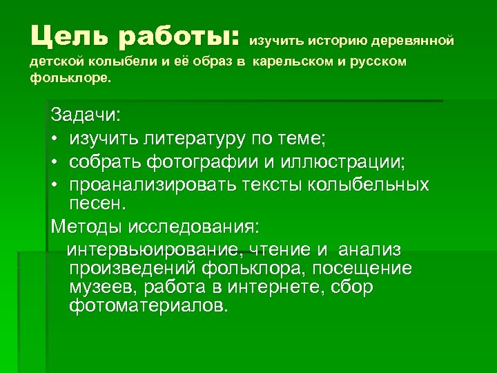 Цель работы: изучить историю деревянной детской колыбели и её образ в карельском и русском фольклоре. Задачи: • изучить литературу по теме; • собрать фотографии и иллюстрации; • проанализировать тексты колыбельных песен. Методы исследования: интервьюирование, чтение и анализ произведений фольклора, посещение музеев, работа в интернете, сбор фотоматериалов.