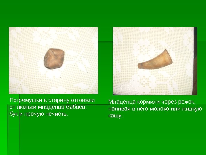 Погремушки в старину отгоняли от люльки младенца бабаев, бук и прочую нечисть. Младенца кормили через рожок, наливая в него молоко или жидкую кашу.