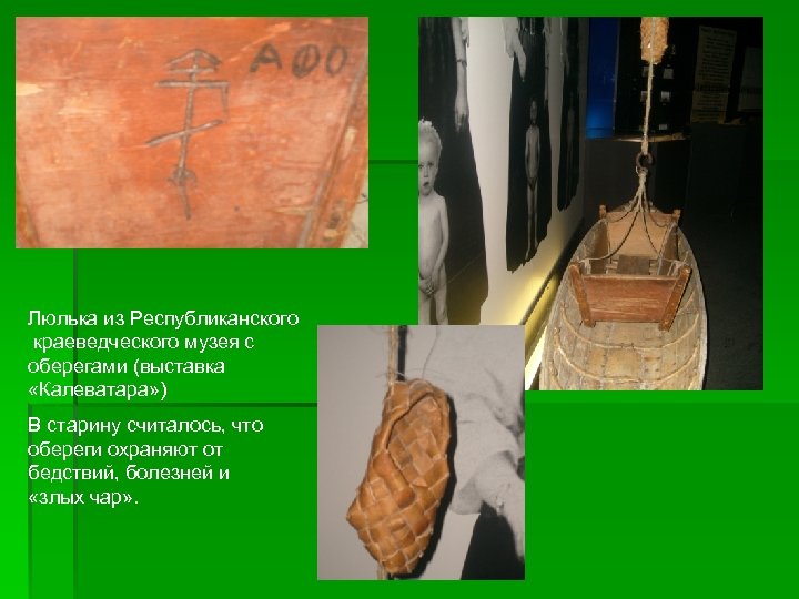 Люлька из Республиканского краеведческого музея с оберегами (выставка «Калеватара» ) В старину считалось, что обереги охраняют от бедствий, болезней и «злых чар» .
