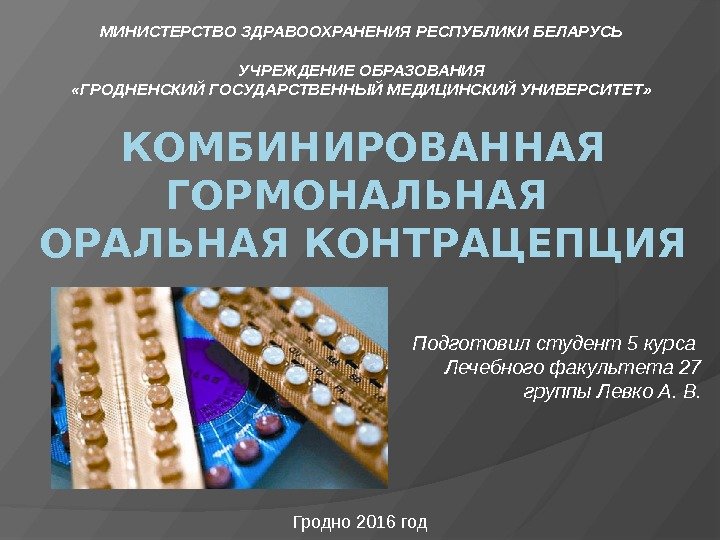 КОМБИНИРОВАННАЯ ГОРМОНАЛЬНАЯ ОРАЛЬНАЯ КОНТРАЦЕПЦИЯ МИНИСТЕРСТВО ЗДРАВООХРАНЕНИЯ РЕСПУБЛИКИ БЕЛАРУСЬ УЧРЕЖДЕНИЕ ОБРАЗОВАНИЯ «ГРОДНЕНСКИЙ ГОСУДАРСТВЕННЫЙ МЕДИЦИНСКИЙ УНИВЕРСИТЕТ» Подготовил студент 5 курса Лечебного факультета 27 группы Левко А. В. Гродно 2016 год