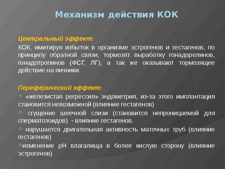 Механизм действия КОК Центральный эффект: КОК, имитируя избыток в организме эстрогенов и гестагенов, по принципу обратной связи, тормозят выработку гонадорелинов, гонадотропинов (ФСГ, ЛГ), а так же оказывают тормозящее действие на яичники. Переферический эффект: «железистая регрессия» эндометрия, из-за этого имплантация становится невозможной (влияние гестагенов) сгущение шеечной слизи (становится непроницаемой для сперматозоидов) — влияние гестагенов. нарушается двигательная активность маточных труб (влияние гестагенов) изменение р. Н влагалища в более кислую сторону (влияние эстрогенов)