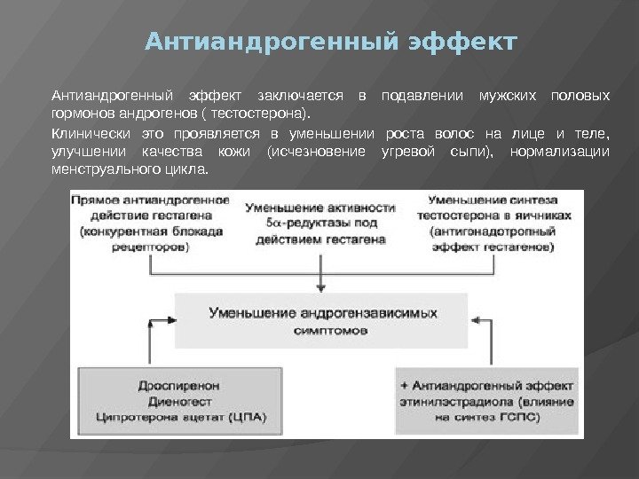 Антиандрогенный эффект заключается в подавлении мужских половых гормонов андрогенов ( тестостерона). Клинически это проявляется в уменьшении роста волос на лице и теле, улучшении качества кожи (исчезновение угревой сыпи), нормализации менструального цикла.