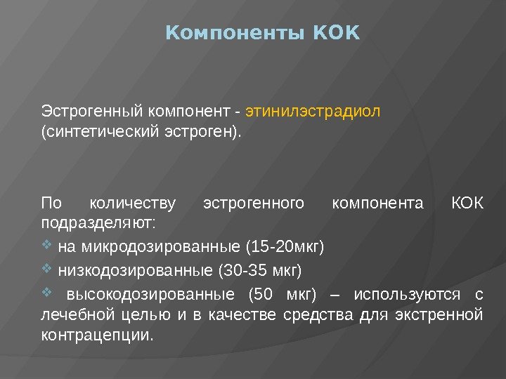 Компоненты КОК Эстрогенный компонент — этинилэстрадиол (синтетический эстроген). По количеству эстрогенного компонента КОК подразделяют: на микродозированные (15 -20 мкг) низкодозированные (30 -35 мкг) высокодозированные (50 мкг) – используются с лечебной целью и в качестве средства для экстренной контрацепции.