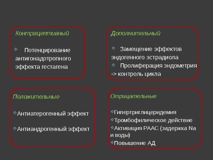 Роль эс трог енного ком понента эт инилэ страдиола (ЭЭ) в К ОК. Эффект ы ЭЭ Положительные Антиатерогенный эффект Антиандрогенный эффект Отрицательные Гипертриглицеридемия Тромбофилическое действие Активация РААС (задержка Na и воды) Повышение АД Контрацептивный Потенцирование антигонадотропного эффекта гестагена Дополнительный Замещение эффектов эндогенного эстрадиола Пролиферация эндометрия -> контроль цикла